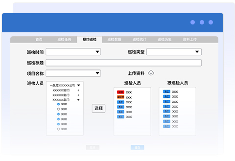 預(yù)約巡檢界面主要用來預(yù)約巡檢會議,在該頁面填寫巡檢時間、巡檢類型、巡檢標(biāo)題、項目名稱以及選擇巡檢人員和被巡檢人員,并上傳本次巡檢的流程資料。